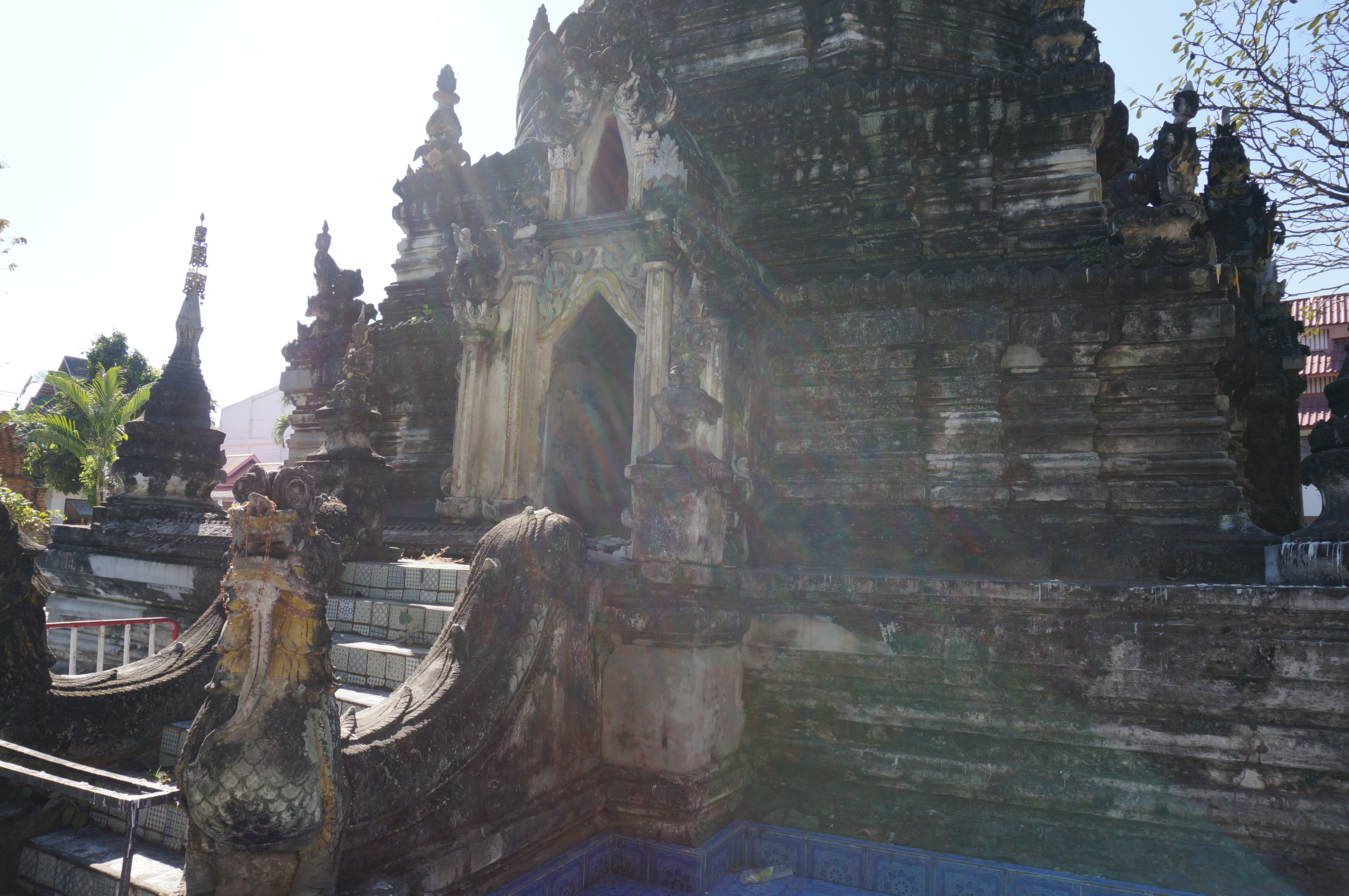 After riding around the moat that encloses central Chiang Mai city, passing wats and enticing cafes, songteaws and fresh fruit stands, I turn the corner and enter into the temple grounds. A quiet hangs over the temple and adjoining school in the late afternoon sun. Children, dressed in blue and white school uniforms play on the playground next to the 500 year old chedi structure. The contrast stands stark between the rusted swings-sets and plastic seesaws with the commanding ancient architecture. I walk the grounds, take it all in. I see things I didn’t notice when I was here before, over two years ago. This time perhaps, I am more attuned to nuance and detail. I see the novice monks looking shyly at the other children laughing boldly, playing rough-house. I see the intricate detail and inlay work done in the chedi mount. I imagine what this place looked like when encircled only by trees and forest animals, instead of low-rise condominiums and coffee shops.